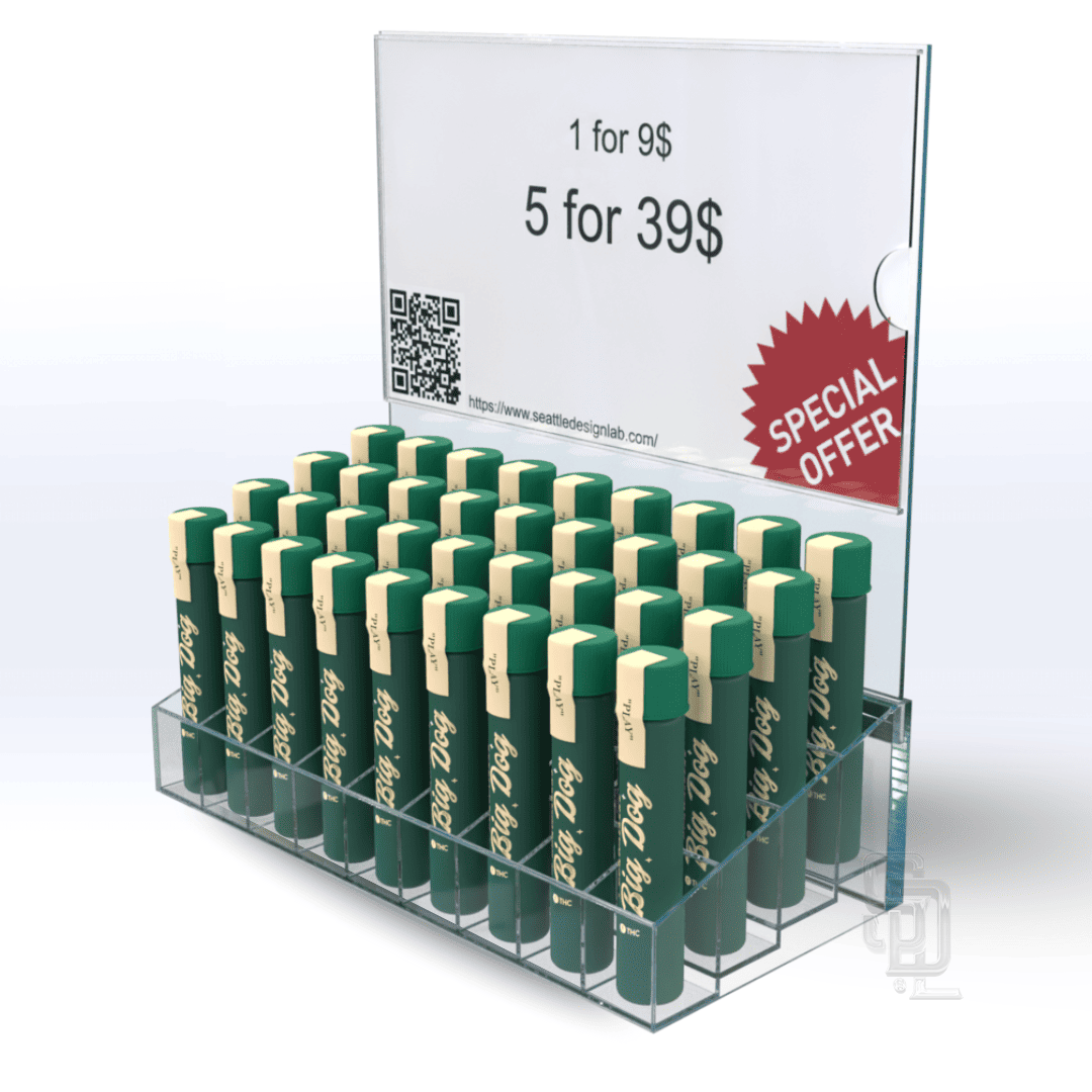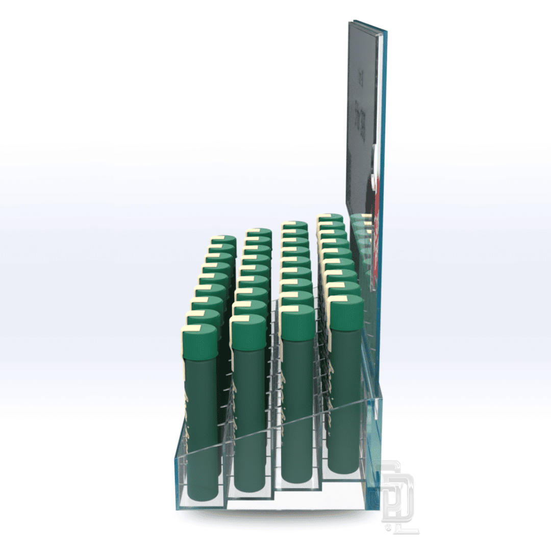Efficiently organize your countertops and display cases with our innovative 36-tube acrylic Pre-roll showcase display. Perfect for products packaged in tubes up to 24mm in diameter.