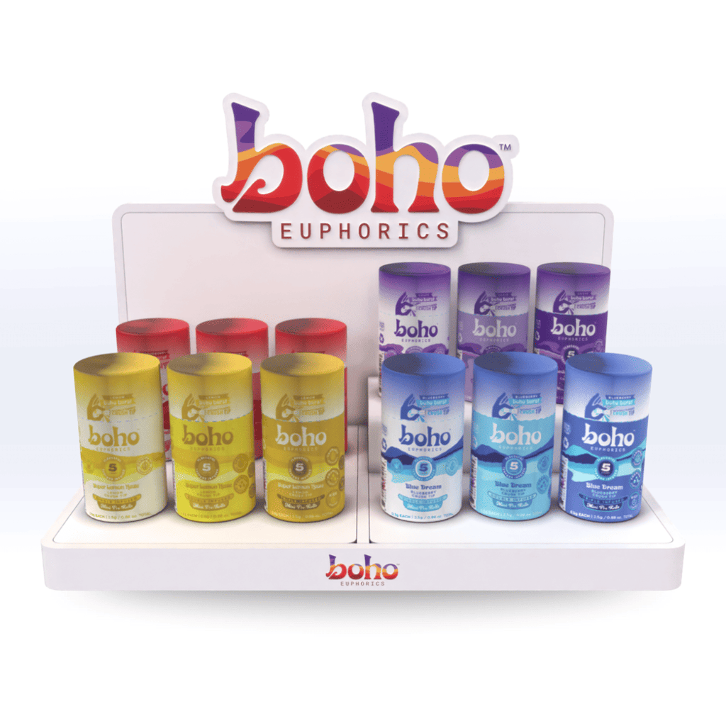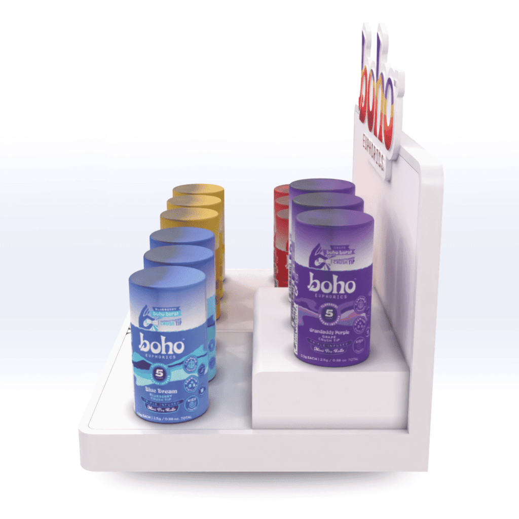 The Model M display is precision-designed to display an array of cannabis and smoke industry products ranging from Pre-roll tubes and flower jars to Vape and Mylar bags. Our 2-tray setup measures 14" wide, 9" Deep and 7" Tall backside.