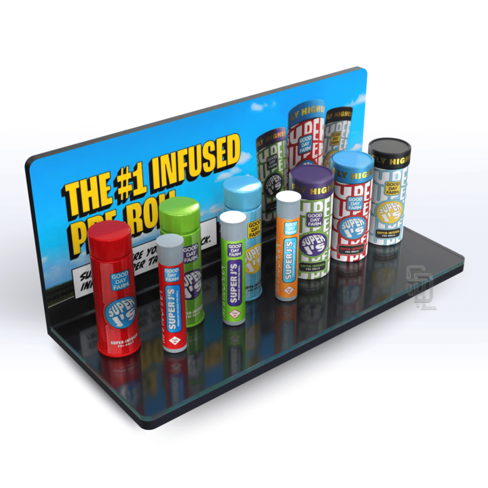 Catch customers' attention with this custom-made acrylic dispensary display is designed to prominently showcase dispensary brand products from any category. Made from high-quality 5mm thick virgin acrylic and the flat surface pedestal is perfect to display Pre-rolls, Concentrates, Flower Bars or Jars, and more!
