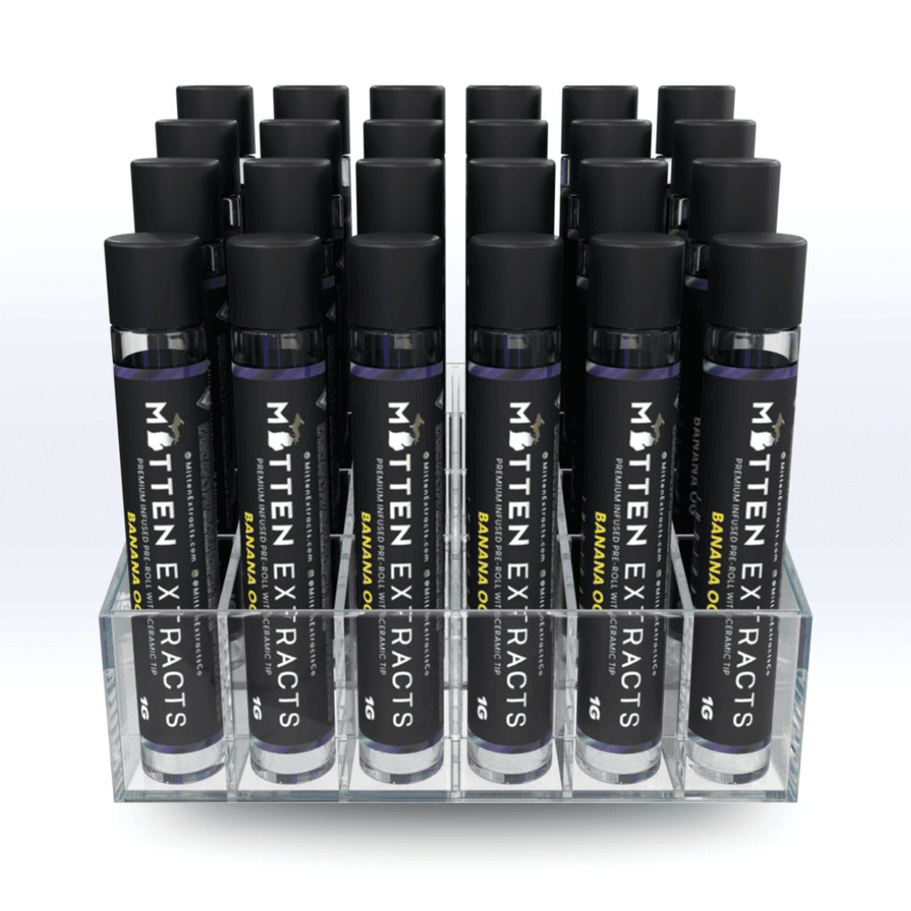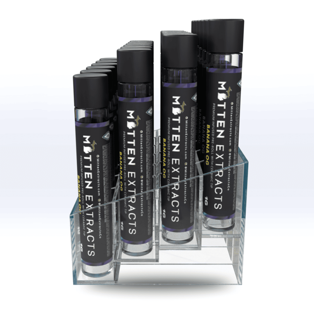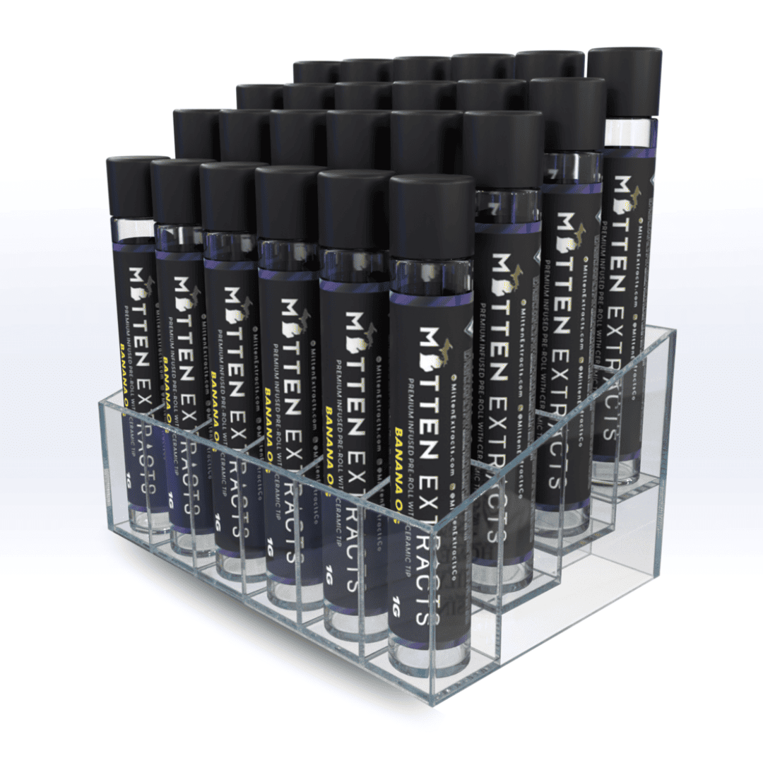 The 24-Tube Pre-roll Prop Display is designed for dispensary and smoke shop retailers, making it the perfect Point-of-purchase display. This setup holds four rows of eight, standard-sized pre-roll tubes, and can be instantly set out on countertops, in display cases, and on any other flat surface to display pre-rolls and drive sales.
