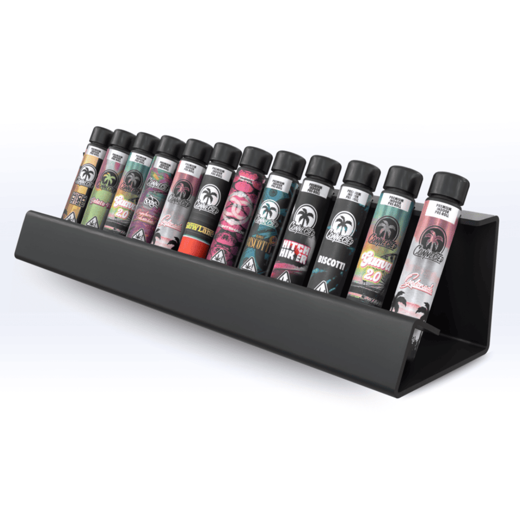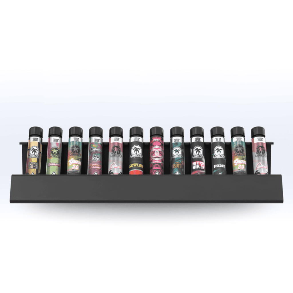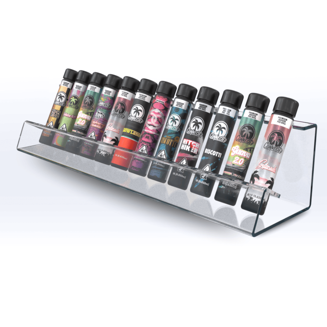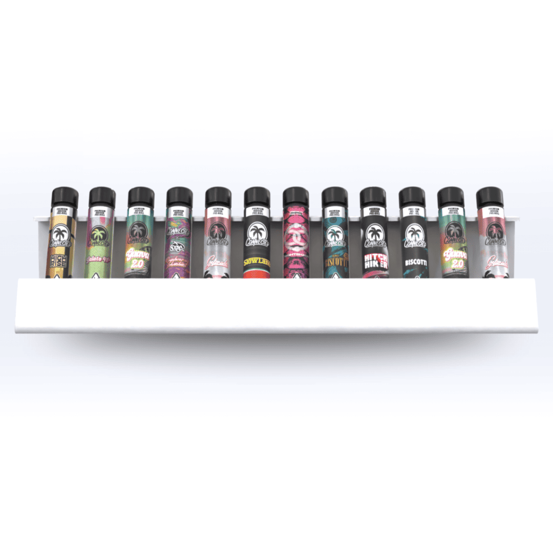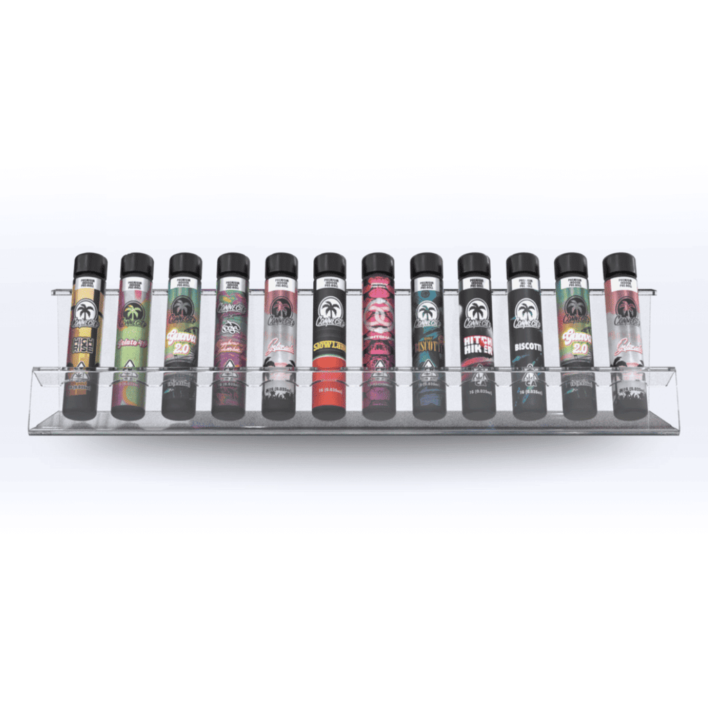 Our 12-Tube Pop Display offers a convenient and attractive way for smoke shops and dispensaries to display their pre-roll category products. Designed with convenience and aesthetics in mind, our 12-Tube Prop display is the premier way to showcase and display retail products packaged in tubes.