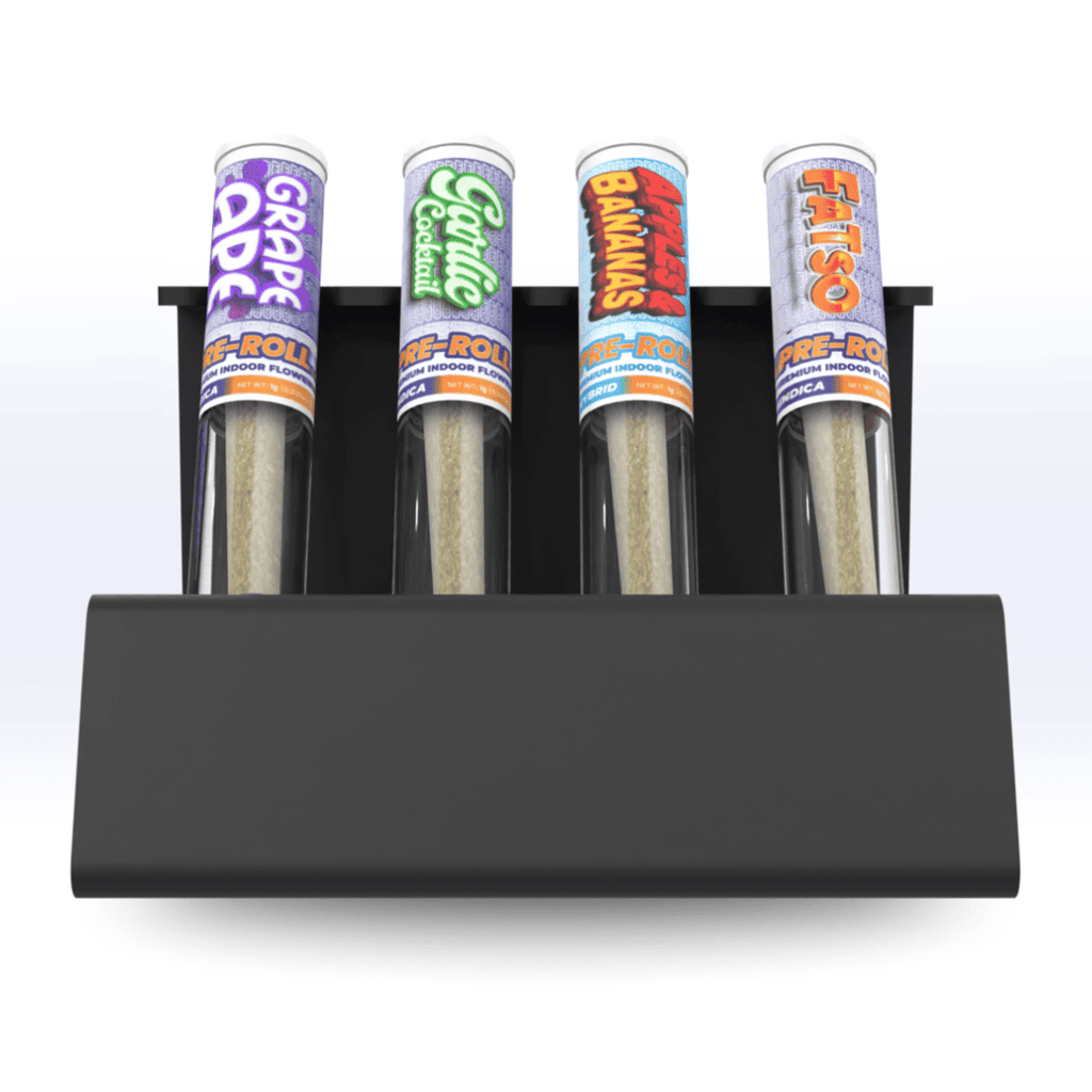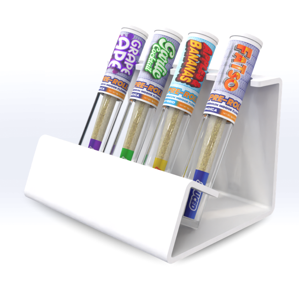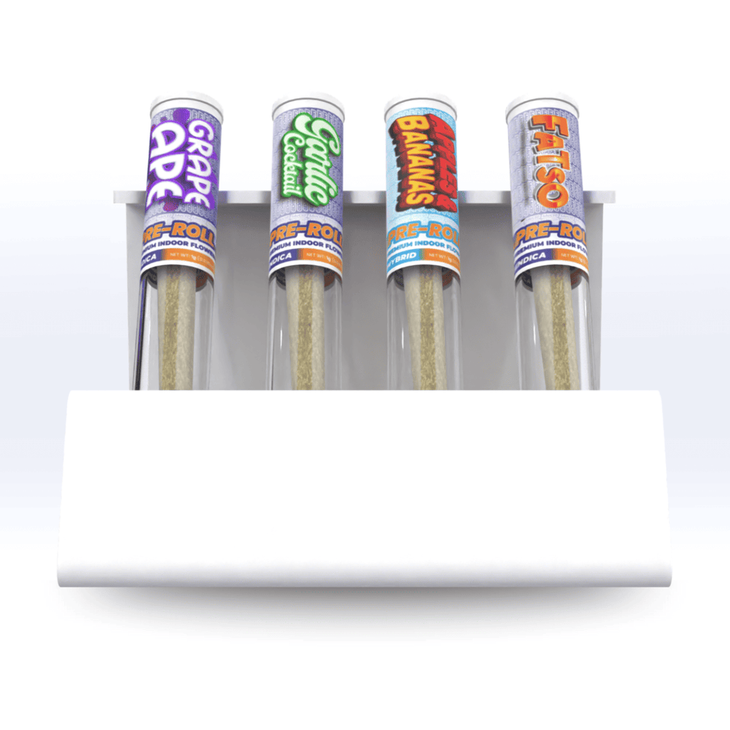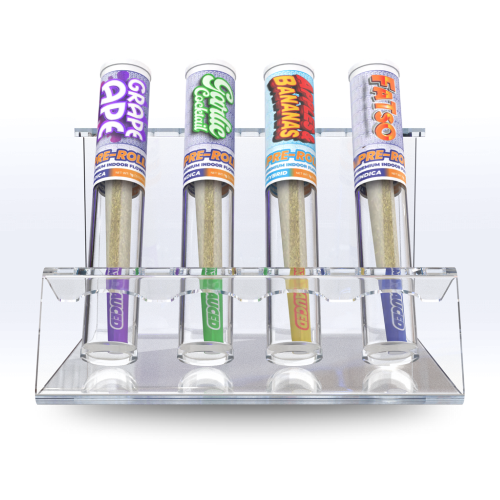 Our 4-Tube Pop Display offers a convenient and attractive way for smoke shops and dispensaries to display their pre-roll category products. Designed with convenience and aesthetics in mind, our 4-Tube Prop display is the premier way to showcase and display retail products packaged in tubes.