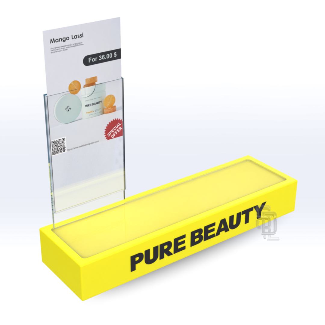 Our Custom Acrylic Block Showcase are one of our most popular, simple and easy to use displays we offer. Made from premium 5mm acrylic, the Block stand features a flat acrylic top for CPG's to easily set on top.Â