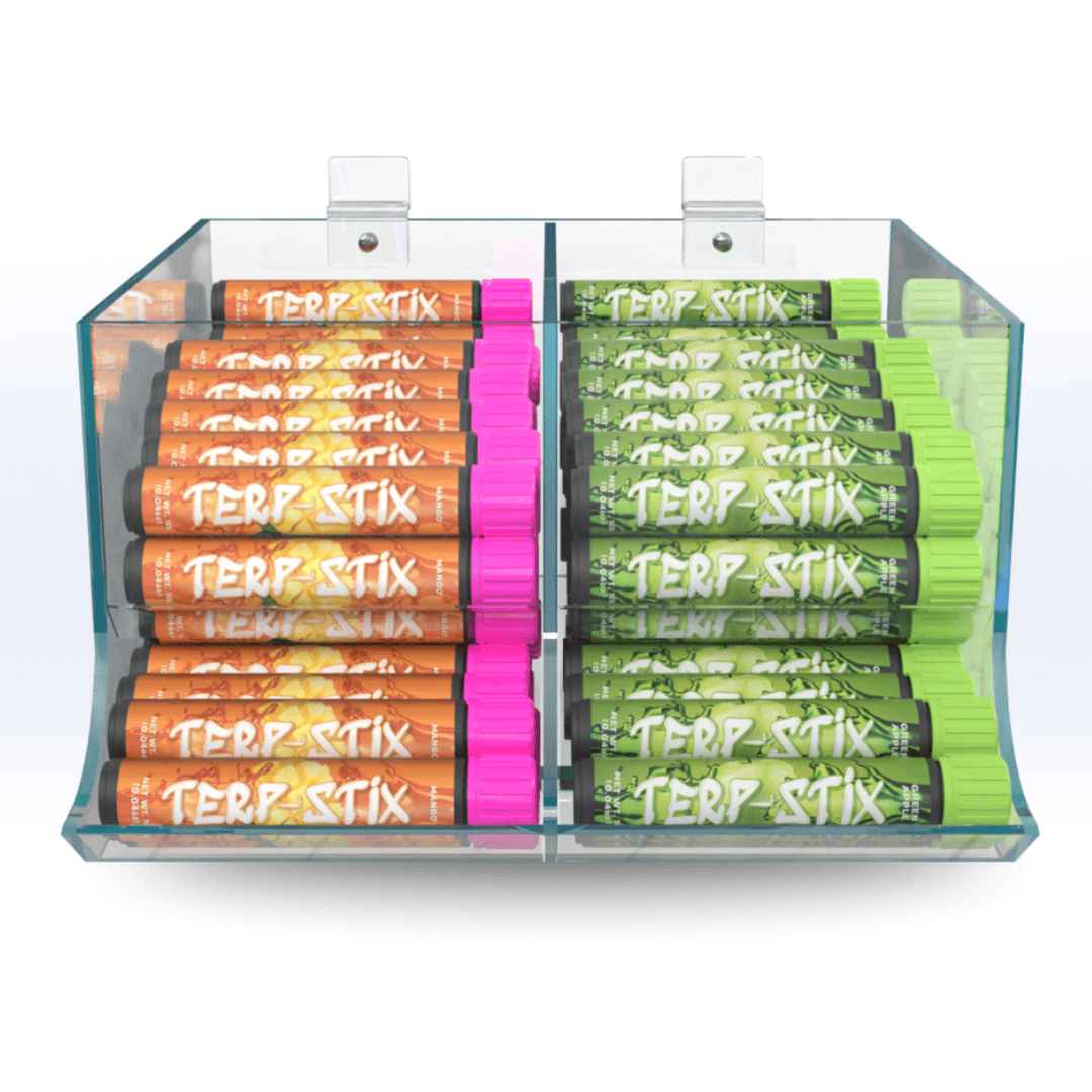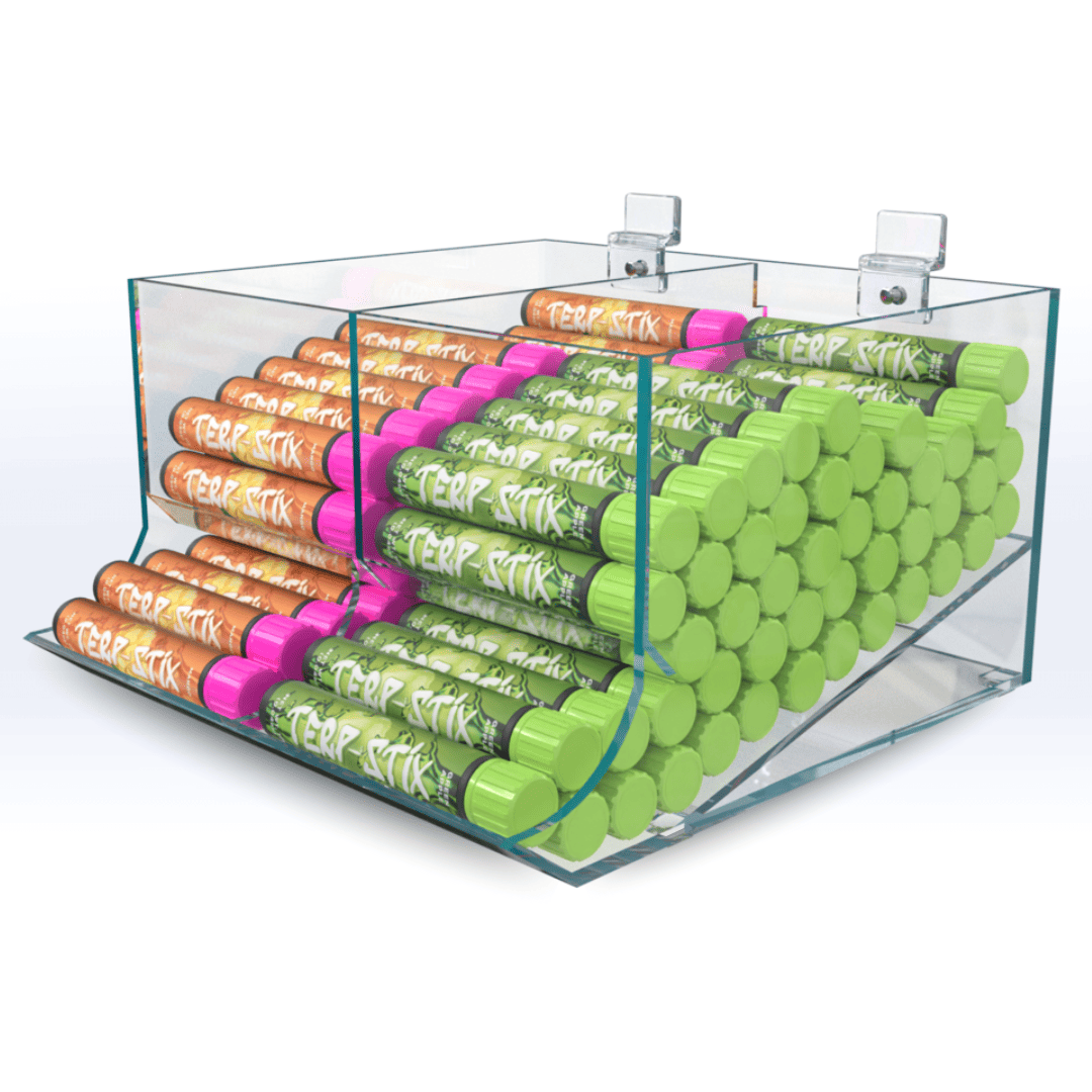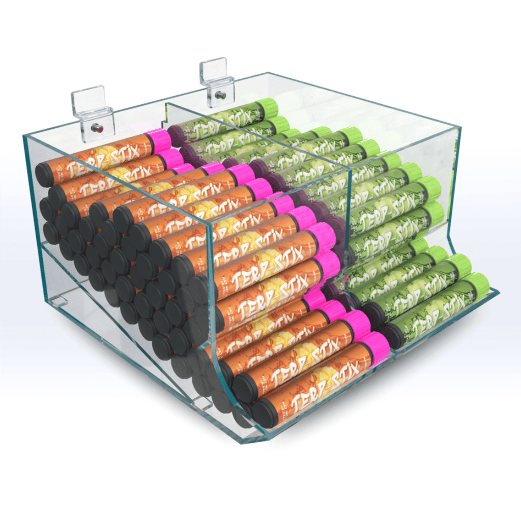 Our Custom Model S Acrylic Pre-roll Display is a stackable, space-saving option for holding and displaying up to 150 pre-roll tubes. Measuring 11" W, 9" D, 5.75" H, the display is perfect for boosting point-of-sale visibility.