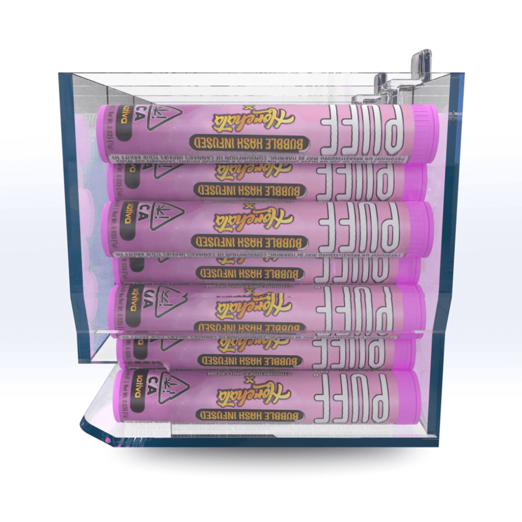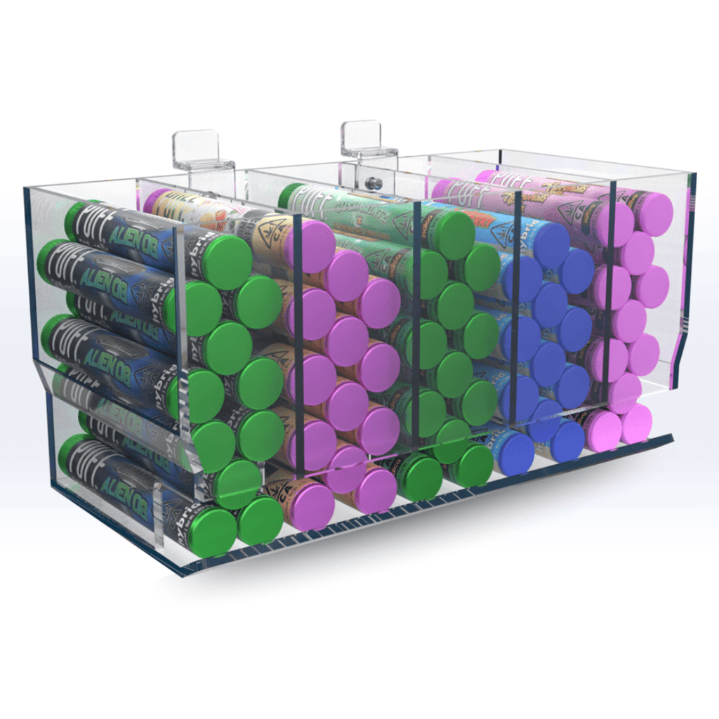 The New Acrylic Model V Display features five vertical columns designed to display, inventory and dispense pre-roll tubes. Our newest display model works great as a point of purchase display in any retail setting, inside or on top of display cases, wall shelves or slat-wall/grid-wall.