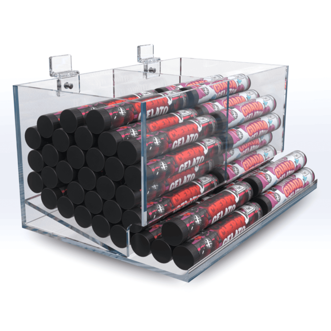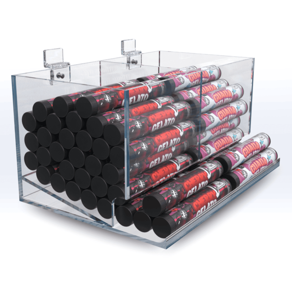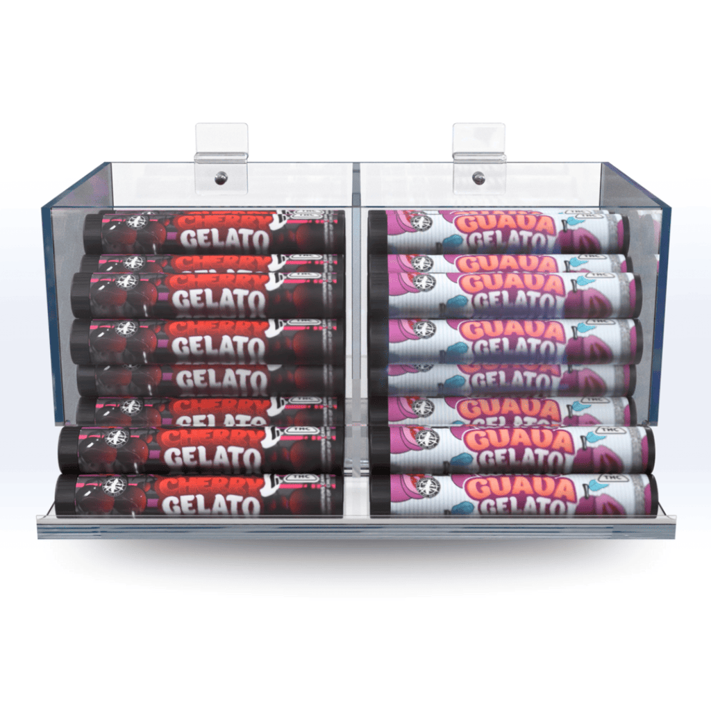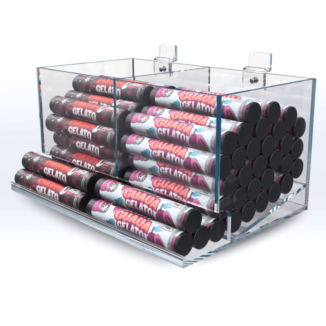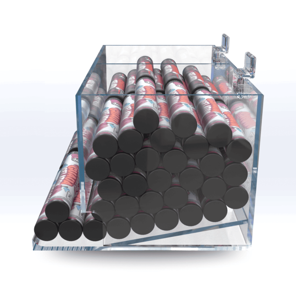 The Tube Tower Display is available in two convenient sizes: 5.5" and 10" Tall, both designed with the ability to use on countertop flat surfaces, or attached to a slatwall or raised-grid wall.