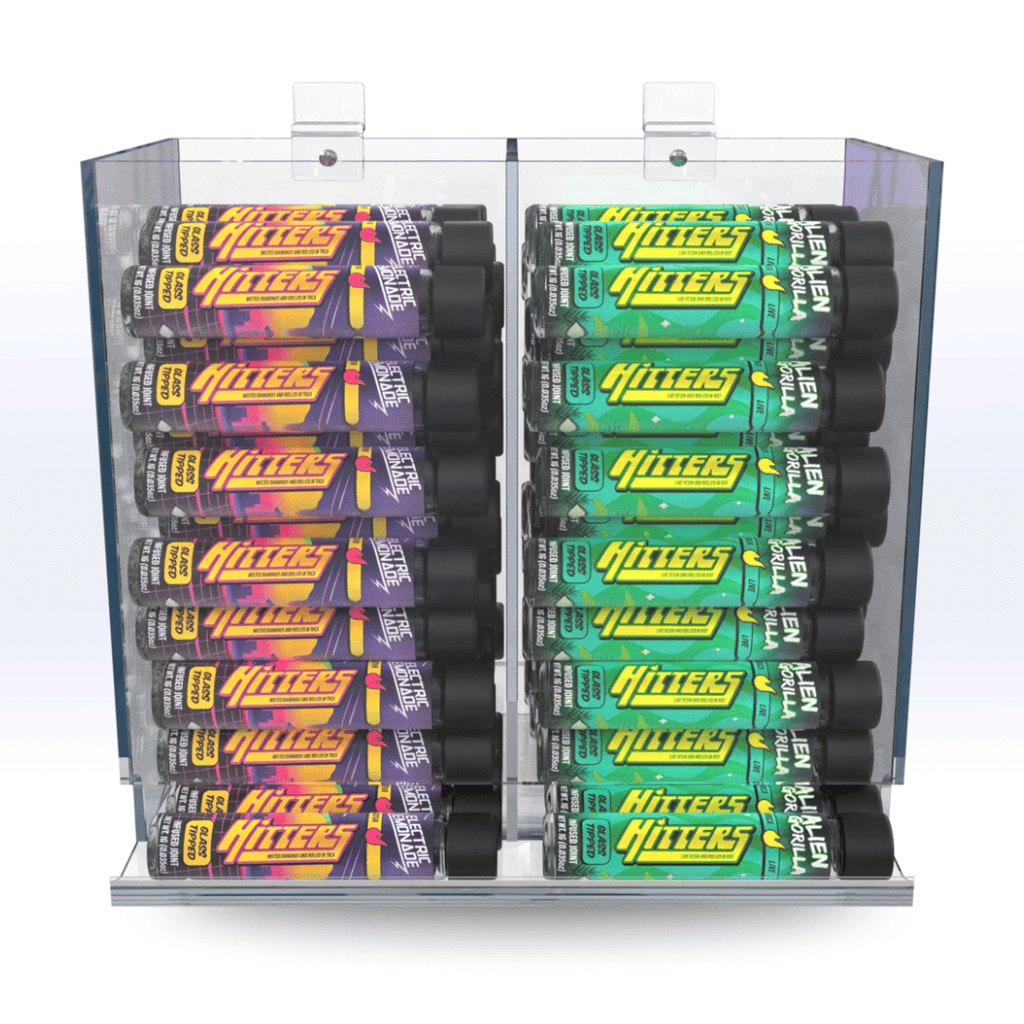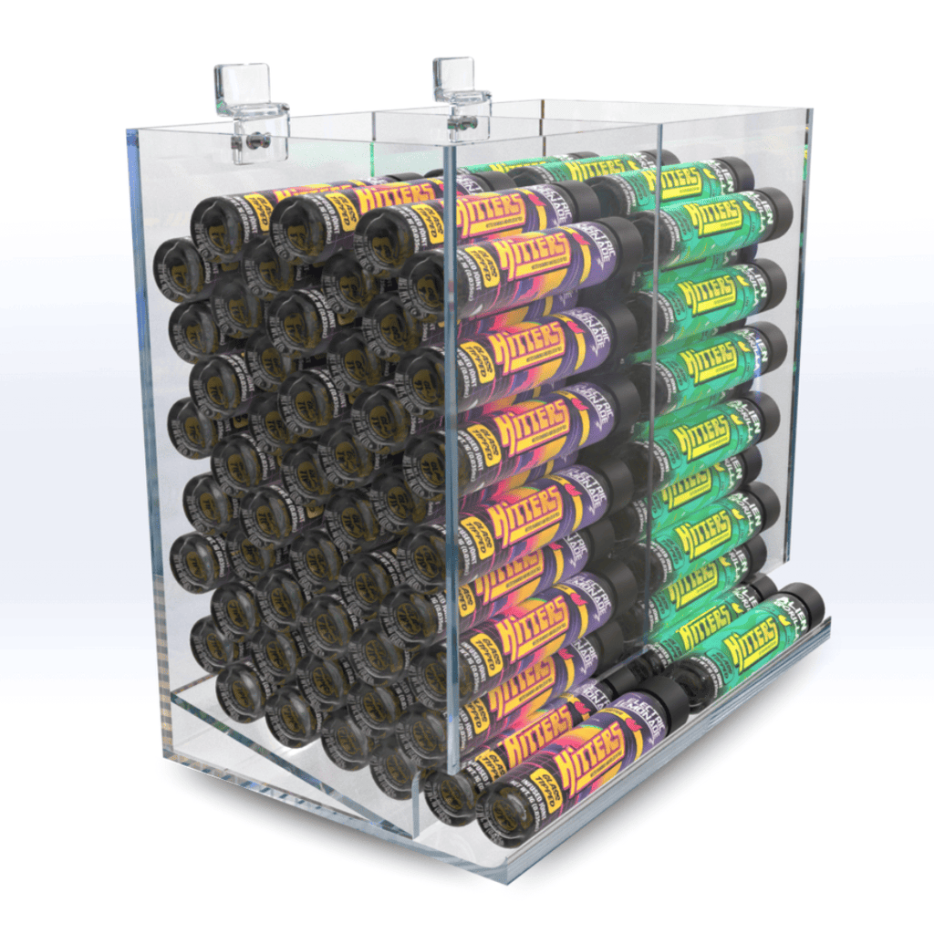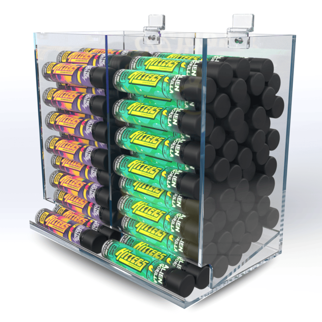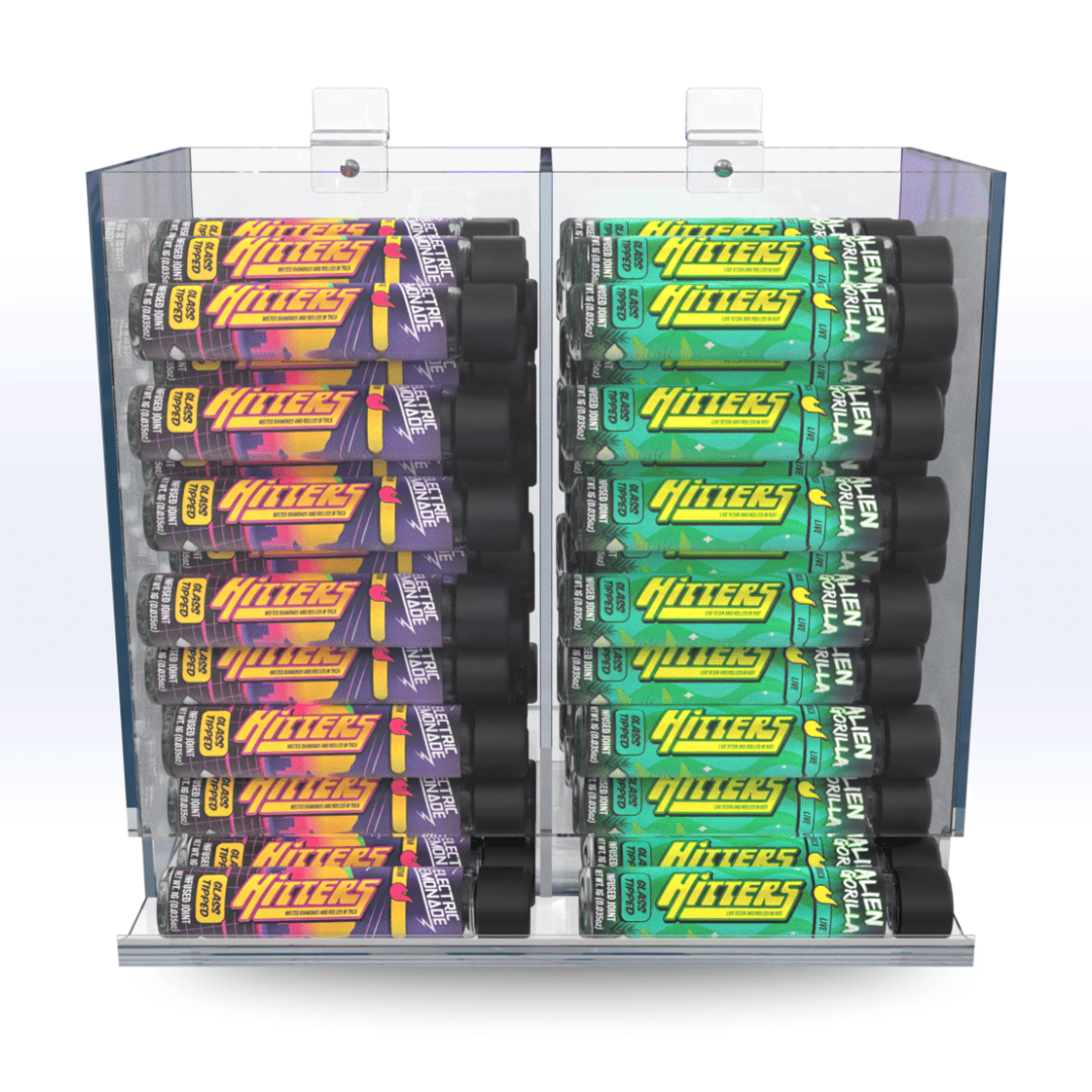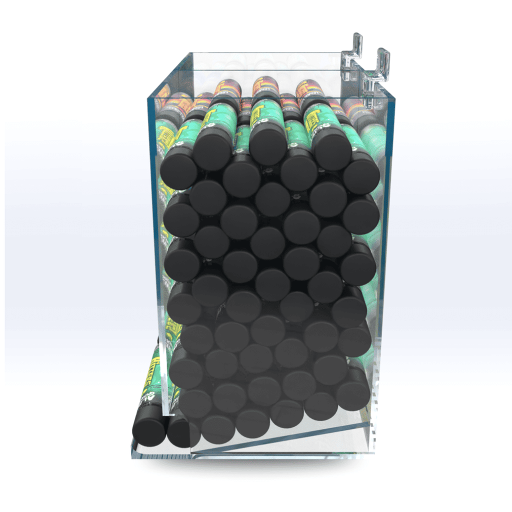 The Tube Tower Display is available in two convenient sizes: 5.5" and 10" Tall, both designed with the ability to use on countertop flat surfaces, or attached to a slatwall or raised-grid wall.
